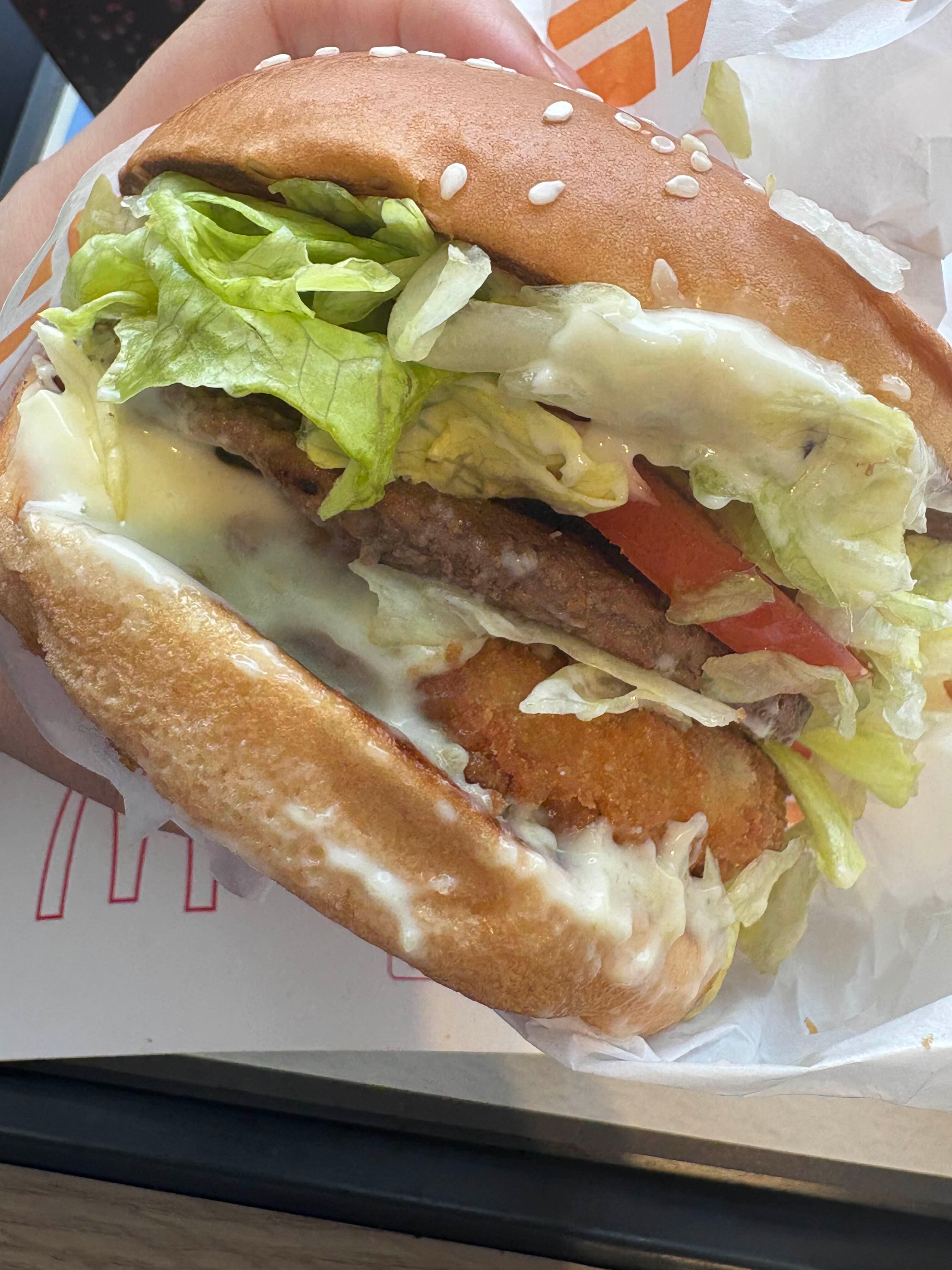 맥도날드 신메뉴익산 고구마 모짜렐라 버거 후기입니다.맥런치 세트에서 감자튀김을 코울슬로로 변경해서(추가금 X) 먹어 봤어요.가격은 8400원입니다.주요 영양성분부터 살펴보자면 칼로리 694kcal단백질 21g포화지방 8g공식 홈페이지 참고했어요.매장에서 주문했고햄버거 모양 유지?를 위한 둥근 띠로 둘러져 있었어요.이거 은근 잘 빼야 처음부터 기분좋게 깔끔하게 먹기 시작할 수 있달까? ㅋㅋㅋㅋ무너지지 않게 딱 잡고 사악 잘 빼줍니다.빵 위아래 면으로 하얀 소스내용물은 양상추, 토마토, 고기 패티, 고구마 모짜렐라 크로켓제일 바닥에 고구마 모짜렐라 크로켓이 깔려 있어서인지버거를 딱 잡았을 때바닥면이 유독 따뜻하게 데워진 느낌이었어요.그래서 먹어보니 치즈가 아주 쫙쫙 늘어날 정도로 많다는 느낌은 아니었지만 잘..
